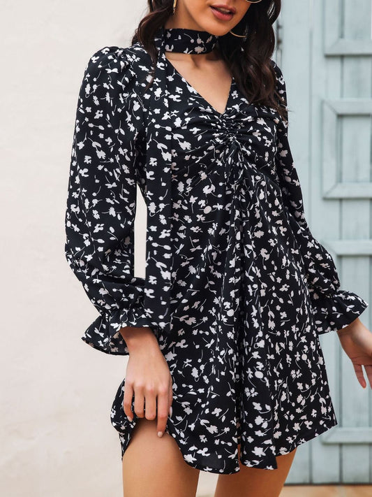 Drawstring V-Neck Long Sleeve Floral Print Chiffon Dress