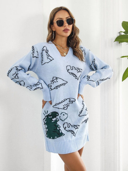 Cute Dinosaur Cartoon Jacquard V-Neck Long Sleeves Sweater Dress