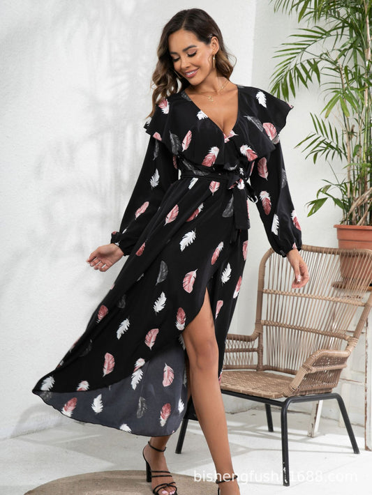 Black Feather Print Ruffle Collar Lantern Sleeve Wrap Dress