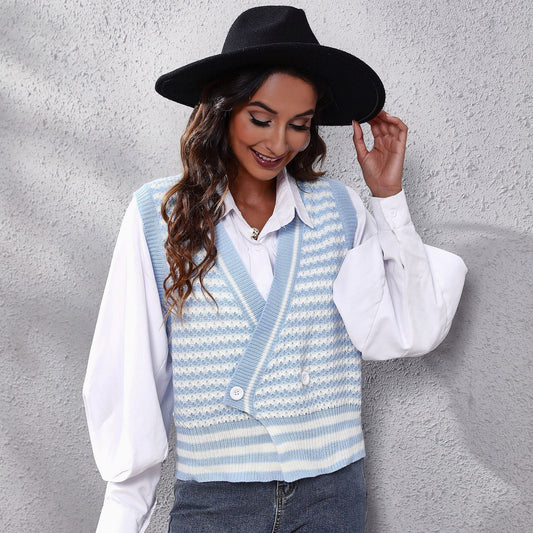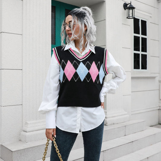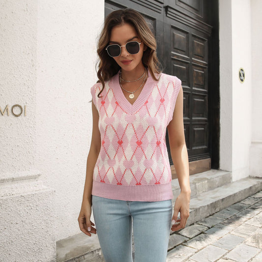 Women Argyle V-Neck Sleeveless Vest Sweater