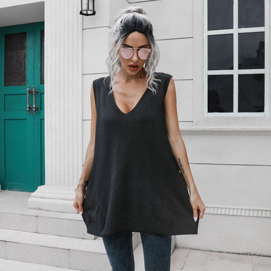 Women Big Pocket Swing V-Neck Mid-Length Loose Sweater Vest
