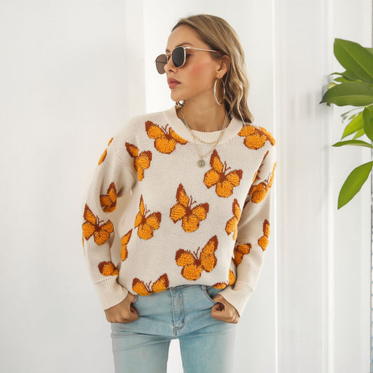 Women Butterfly Printed Long Sleeve Round Neck Pullover Sweater