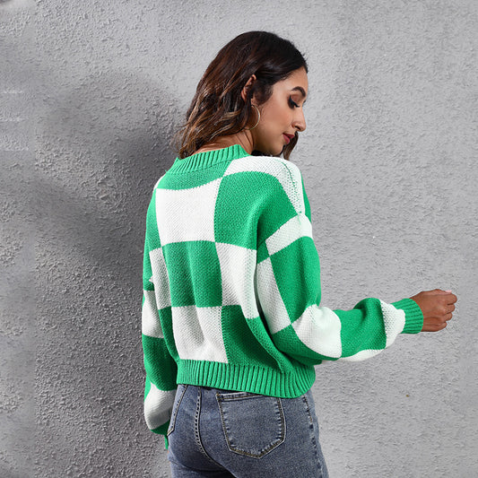 Women Bow Checked Long Sleeve Round Neck Printed Pullover Sweater