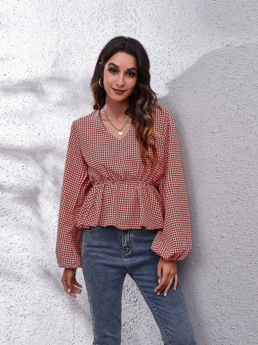 Women Checked V Neck Puff Sleeves Cinched Waist Top