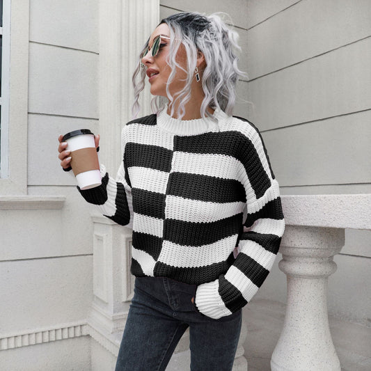 Women Colorbock Broad Strip Round Neck Long Sleeve Loose Sweater Pullover