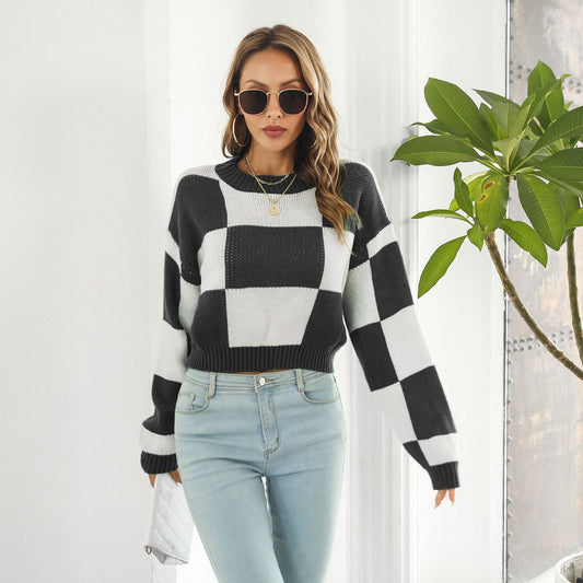 Women Checkerboard Long-Sleeved Round Neck Short Sweater Pullover