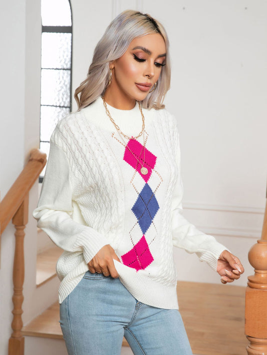 Women Colourblocked Diamond Print Long Sleeve Crop Pullover