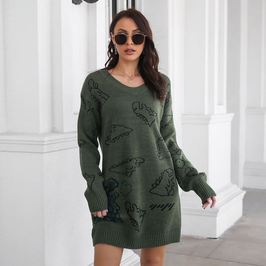 Women Dinosaur Print V-Neck Drop Shoulder Long Sleeve Sweater Dress