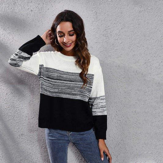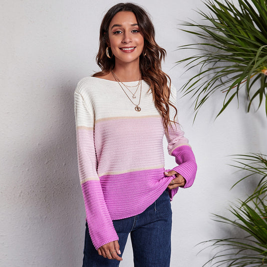Women Colourblocked Striped Boat Neck Long Sleeve Pullover Sweater