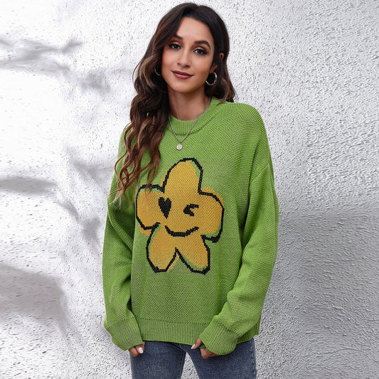 Women Cute Flower Smiley Face Cartoon Print Sweater Pullover