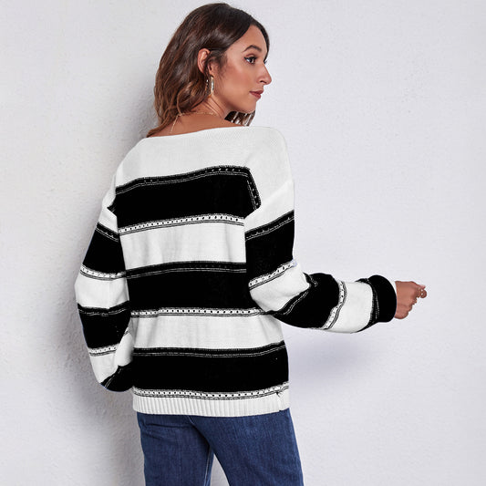 Women Contrast Color Large Striped One-Shoulder Sweater