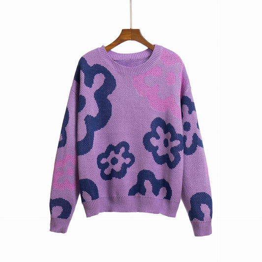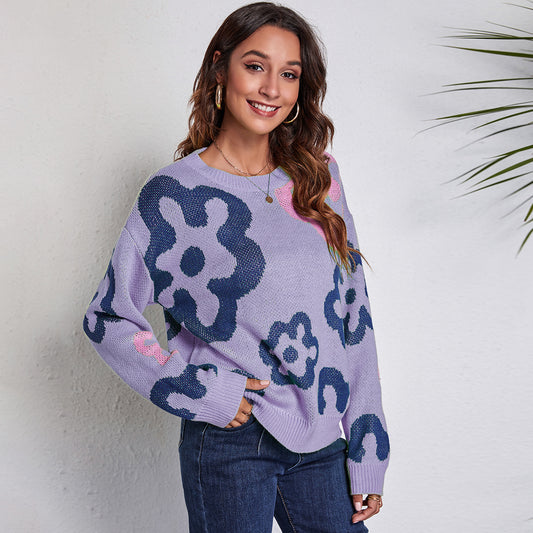 Women Floral Printed Jacquard Drop Shoulder Knitted Sweater