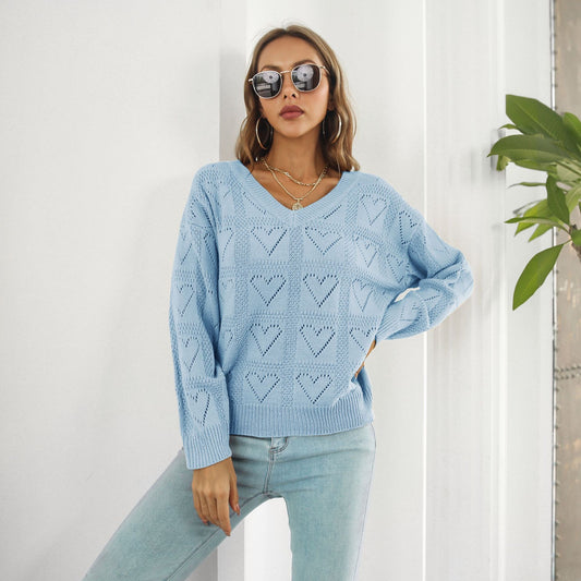 Women Hollow Love Plaid V-Neck Long-Sleeve Pullover Sweater
