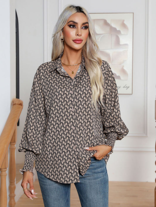 Women Geometric Print Lantern Long Sleeve Spread Collar Casual Shirt