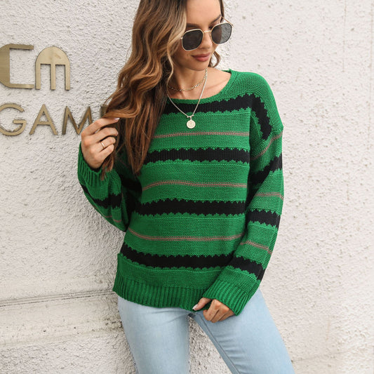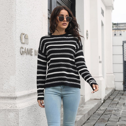 Women Round Neck Long Sleeve Striped Pullover Sweater