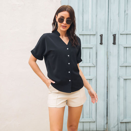 Women Roll-Up Short Sleeve Mandarin Collar Solid Formal Shirt