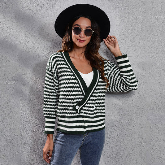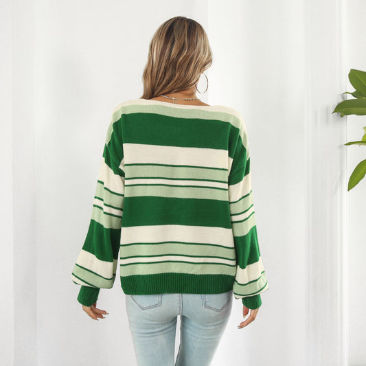 Women Striped V-Neck Long-Sleeved Knitted Sweater