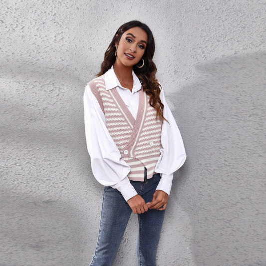 Women Striped Spread Collar Short-Sleeved Pullover Sweater