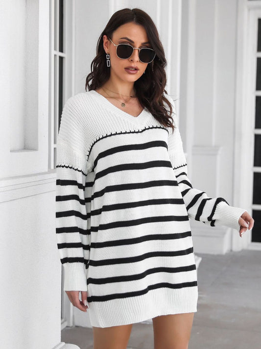 Womens Striped V-Neck Long Sleeves Sweater Dress