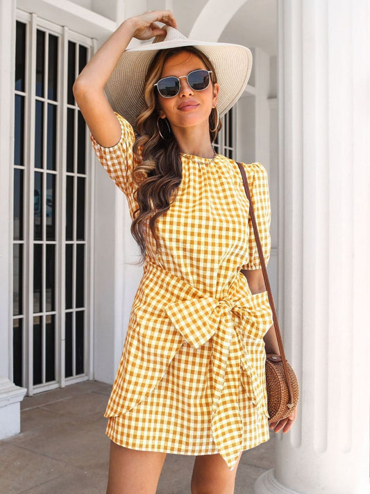 Womens Summer Lantern Sleeves Knotted Wrap Dress