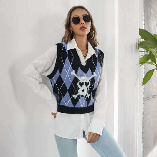 Women V-Neck Sleeveless Halloween Skull Jacquard Diamond Vest Sweater