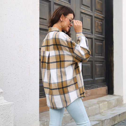 Women Woolen Tartan Checked Spread Collar Long Sleeveâ Casualâ Shirt