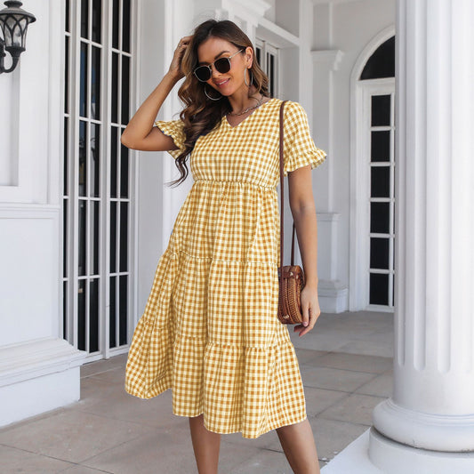 Womens Plaid Ruffled V-Neck Short Sleeves Midi Dress