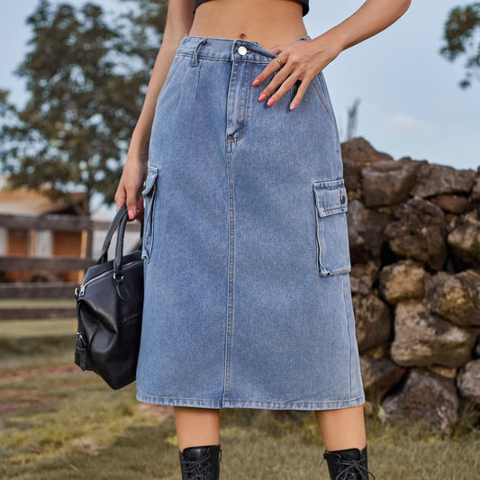 Oh Rare Navy Blue Denim High-Slit Straight Midi Skirt