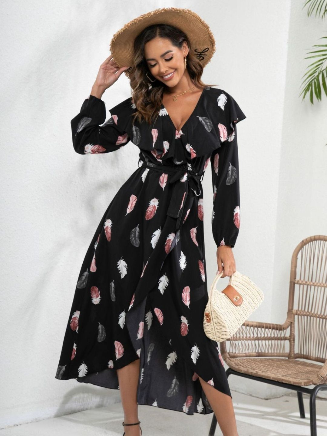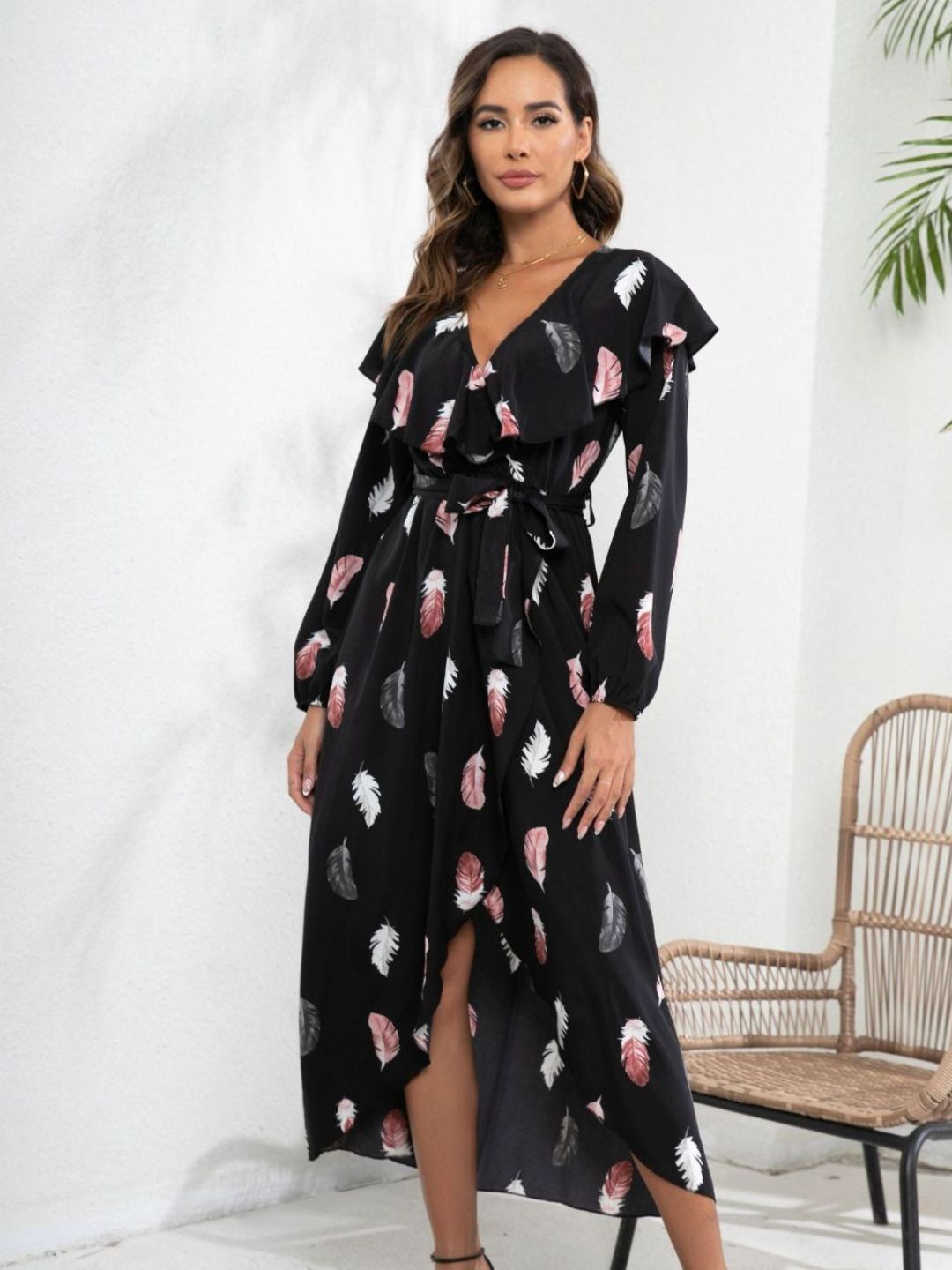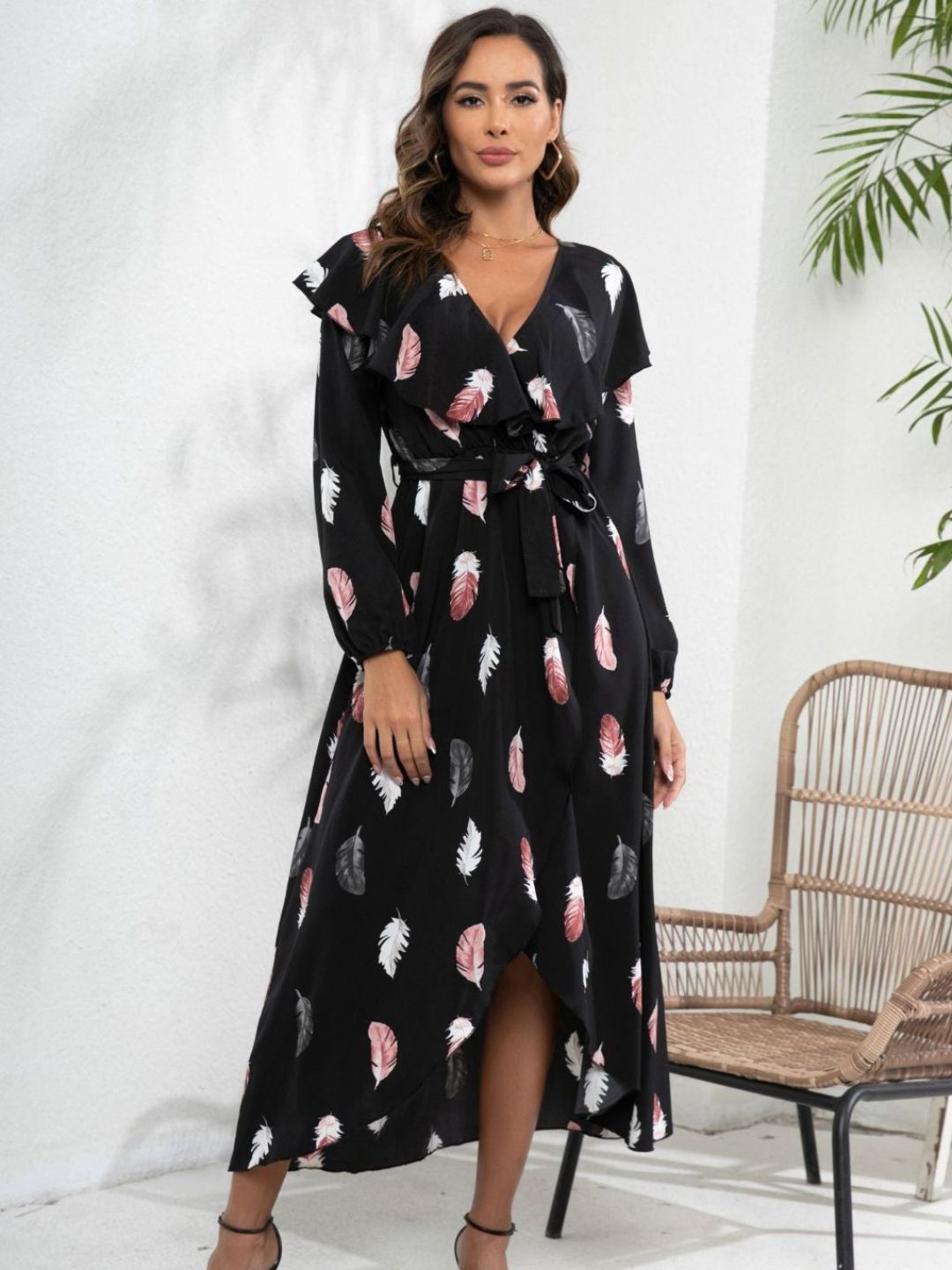Black Feather Print Ruffle Collar Lantern Sleeve Wrap Dress