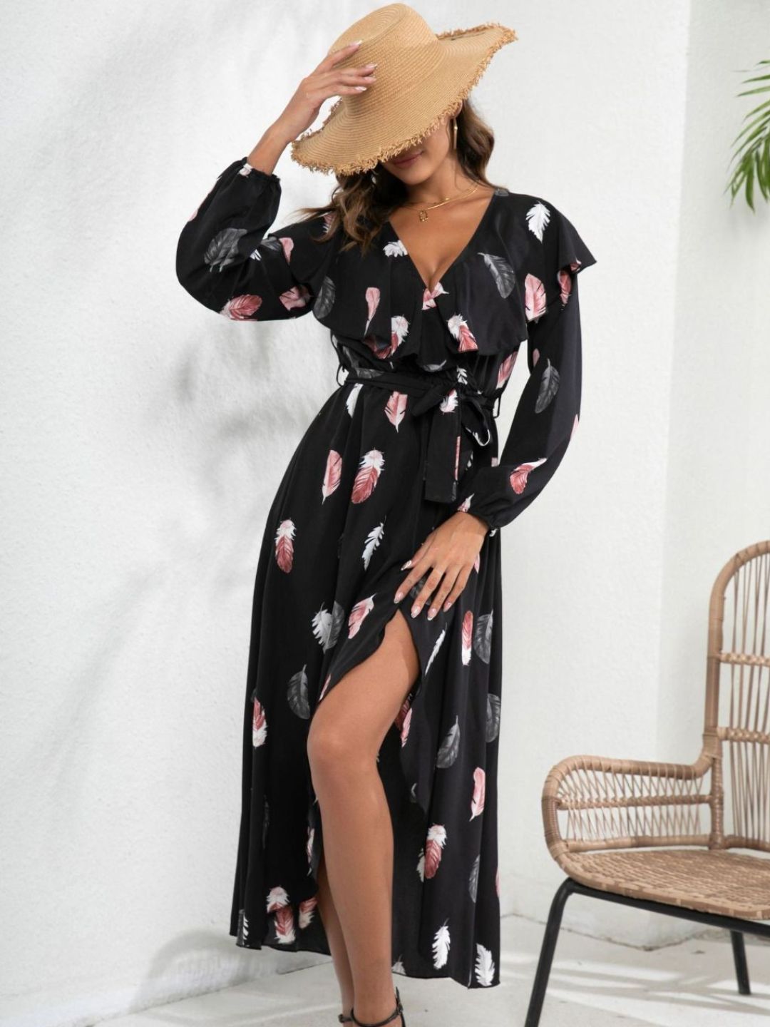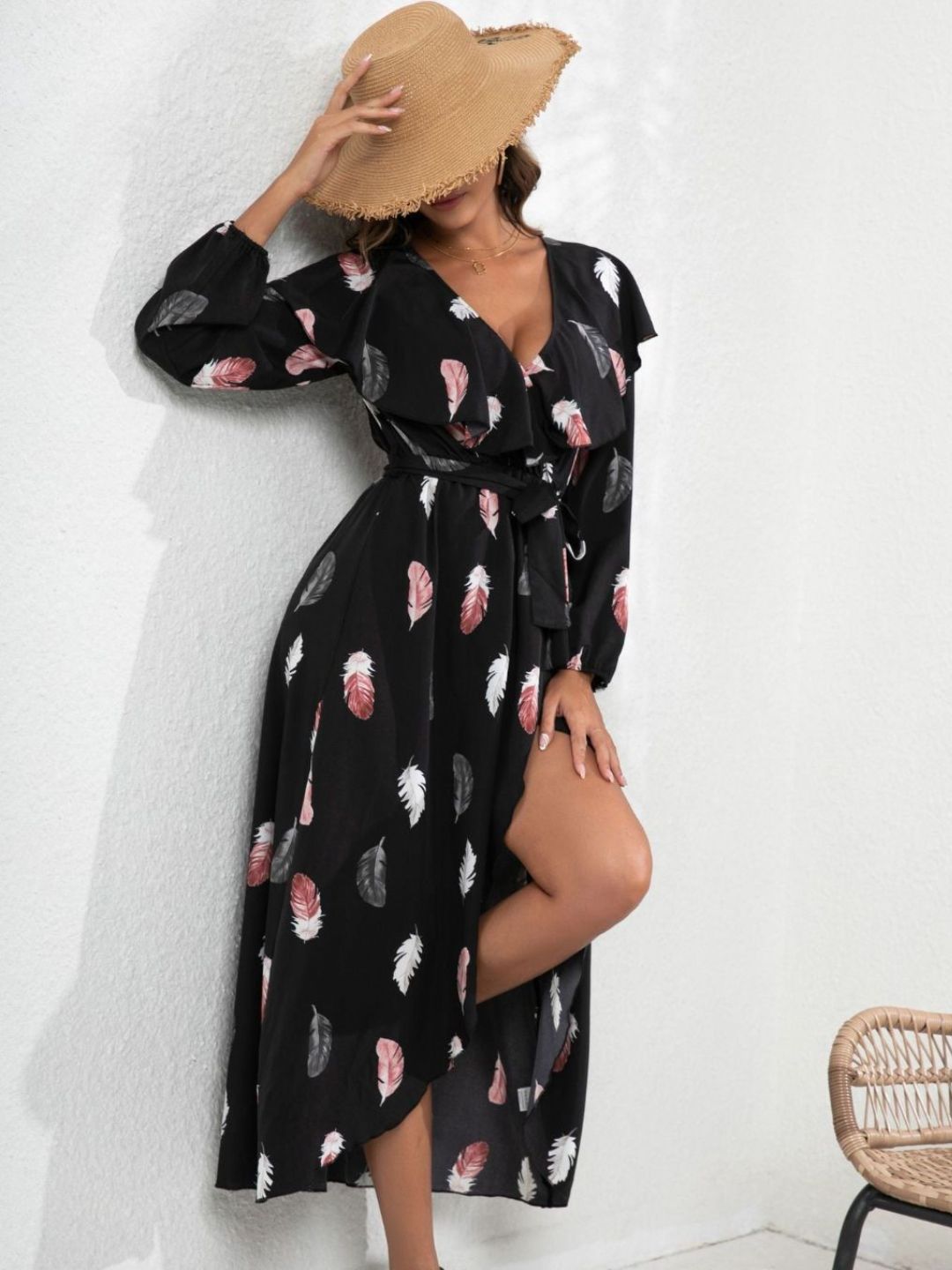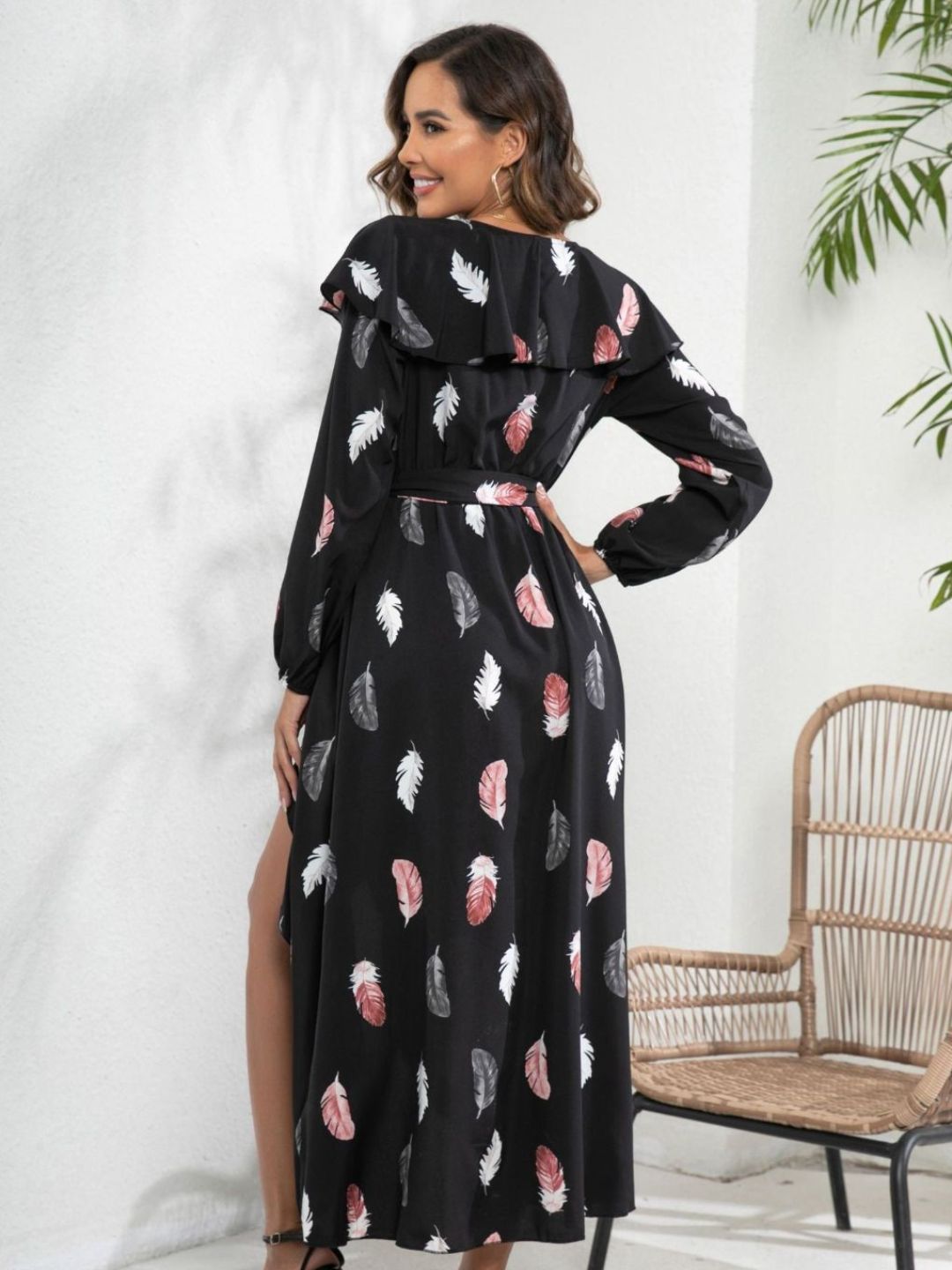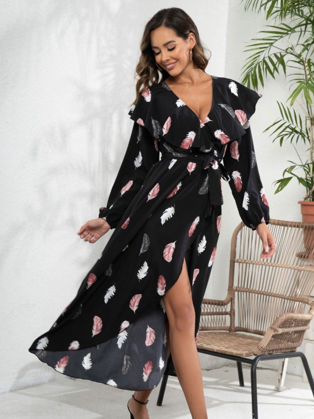 Black Feather Print Ruffle Collar Lantern Sleeve Wrap Dress