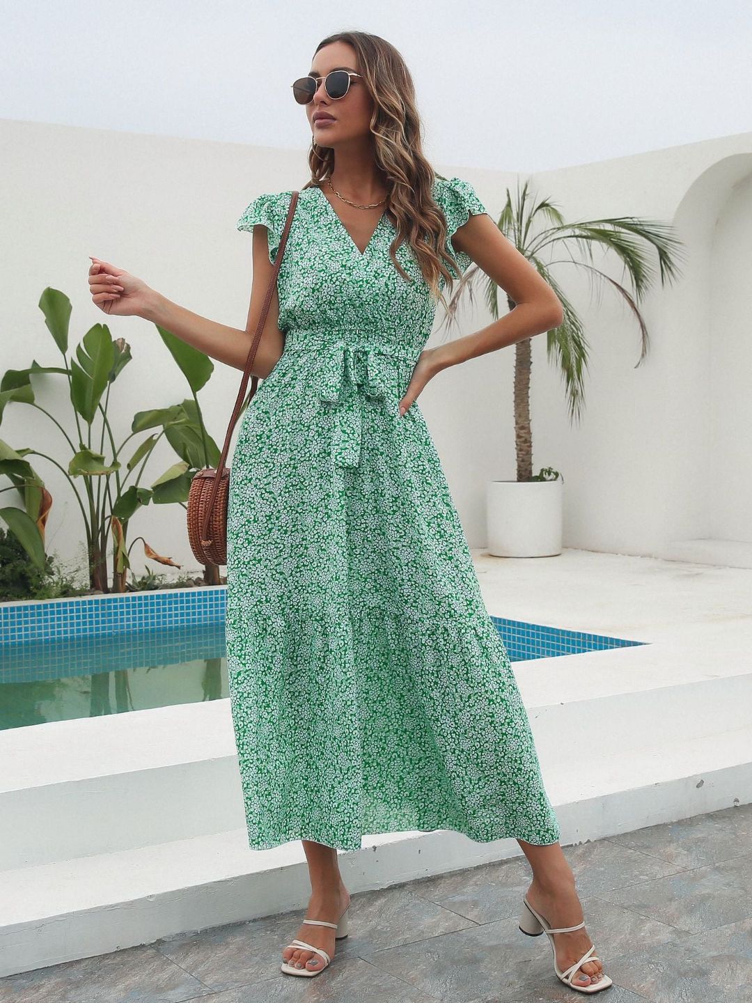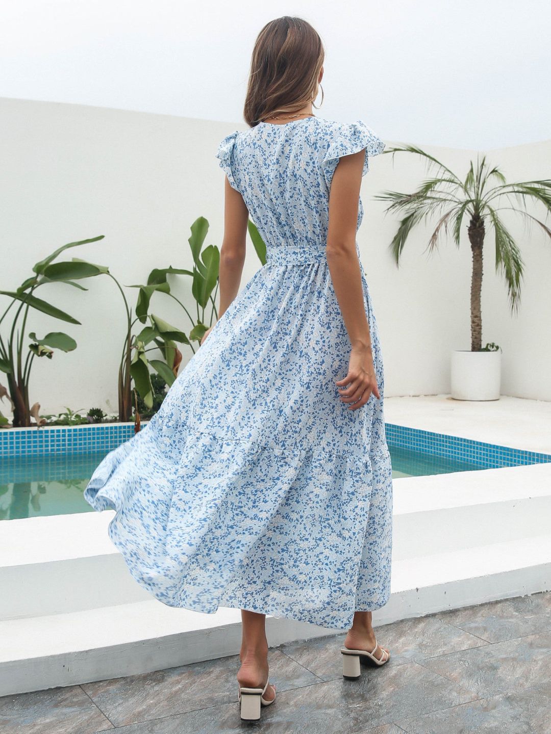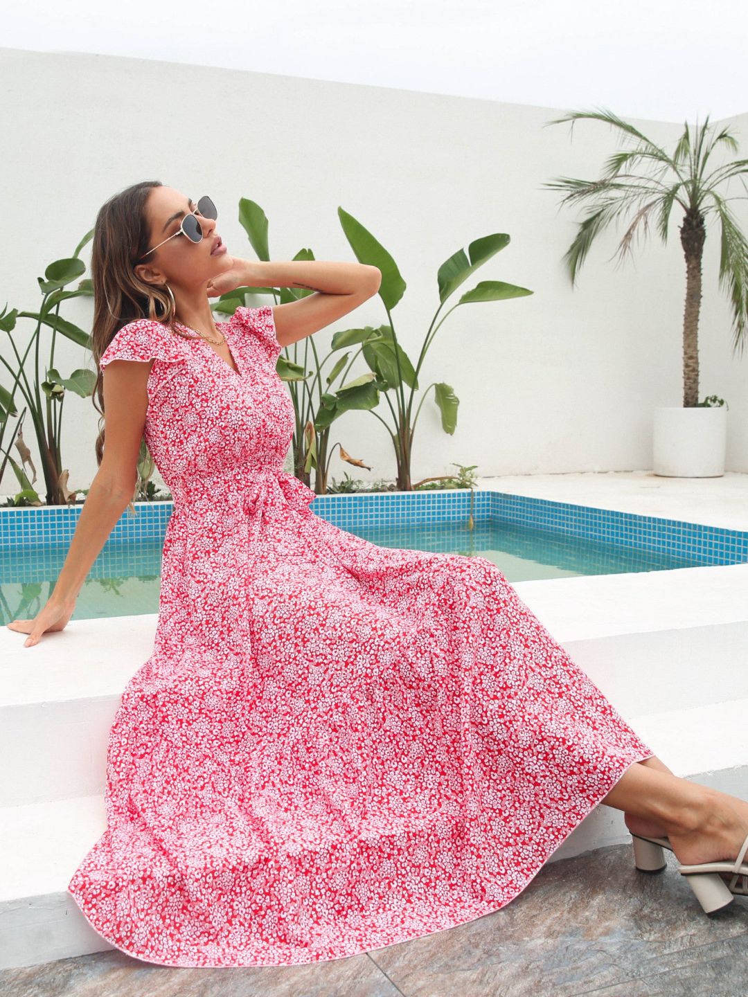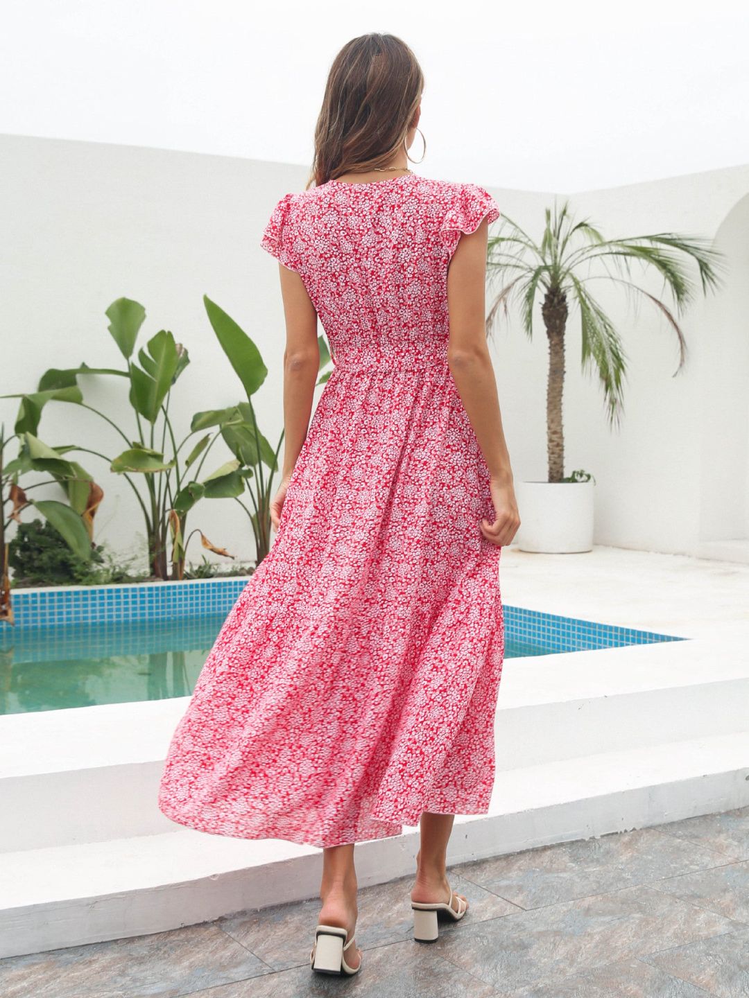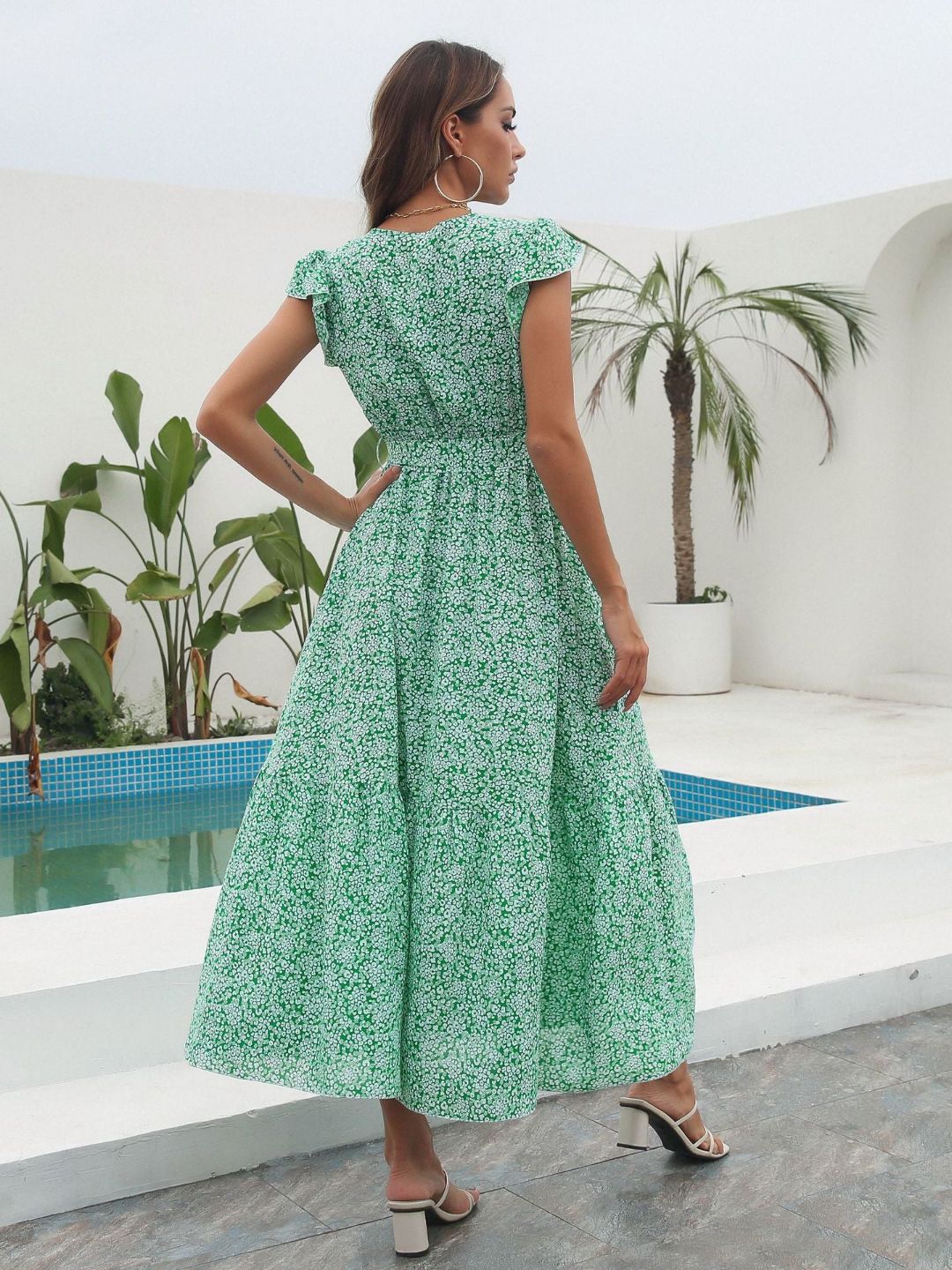Floral Ruffled V-Neck Short Sleeves Printed Chiffon Long Dress