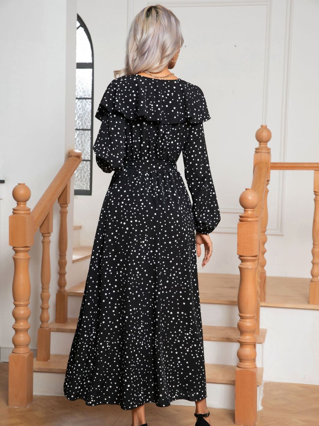 Black Polka Dot Print Lotus Leaf Collar Lantern Long Sleeves Wrap Dress